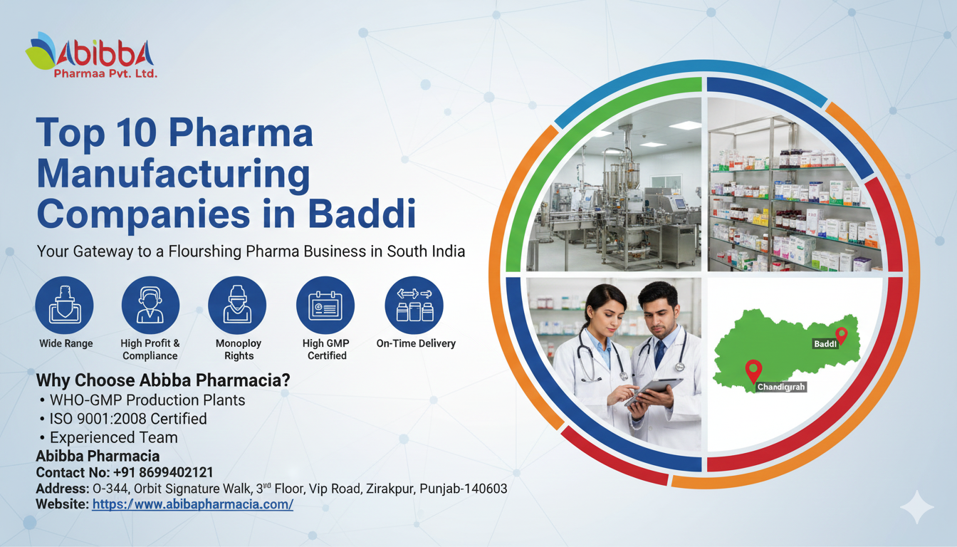 Some of the top pharma manufacturing companies in Baddi include Abiba Pharmacia, Associated Biotech, Alpha Drug, Asterisk Healthcare, Saphnix Lifesciences, Stensa Lifesciences, Medlock Healthcare, Sanify Healthcare, Servocare Lifesciences, Krishlar Pharmaceuticals, and Apikos Pharma.